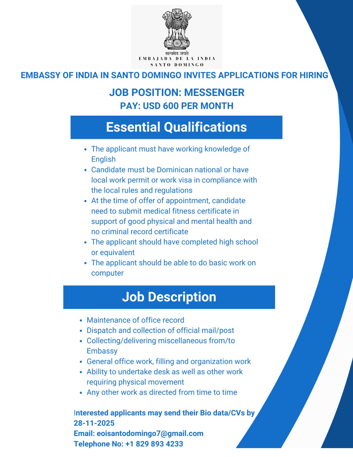 Vacancy for Post of Messenger at Embassy of India in the Dominican Republic (Santo Domingo).